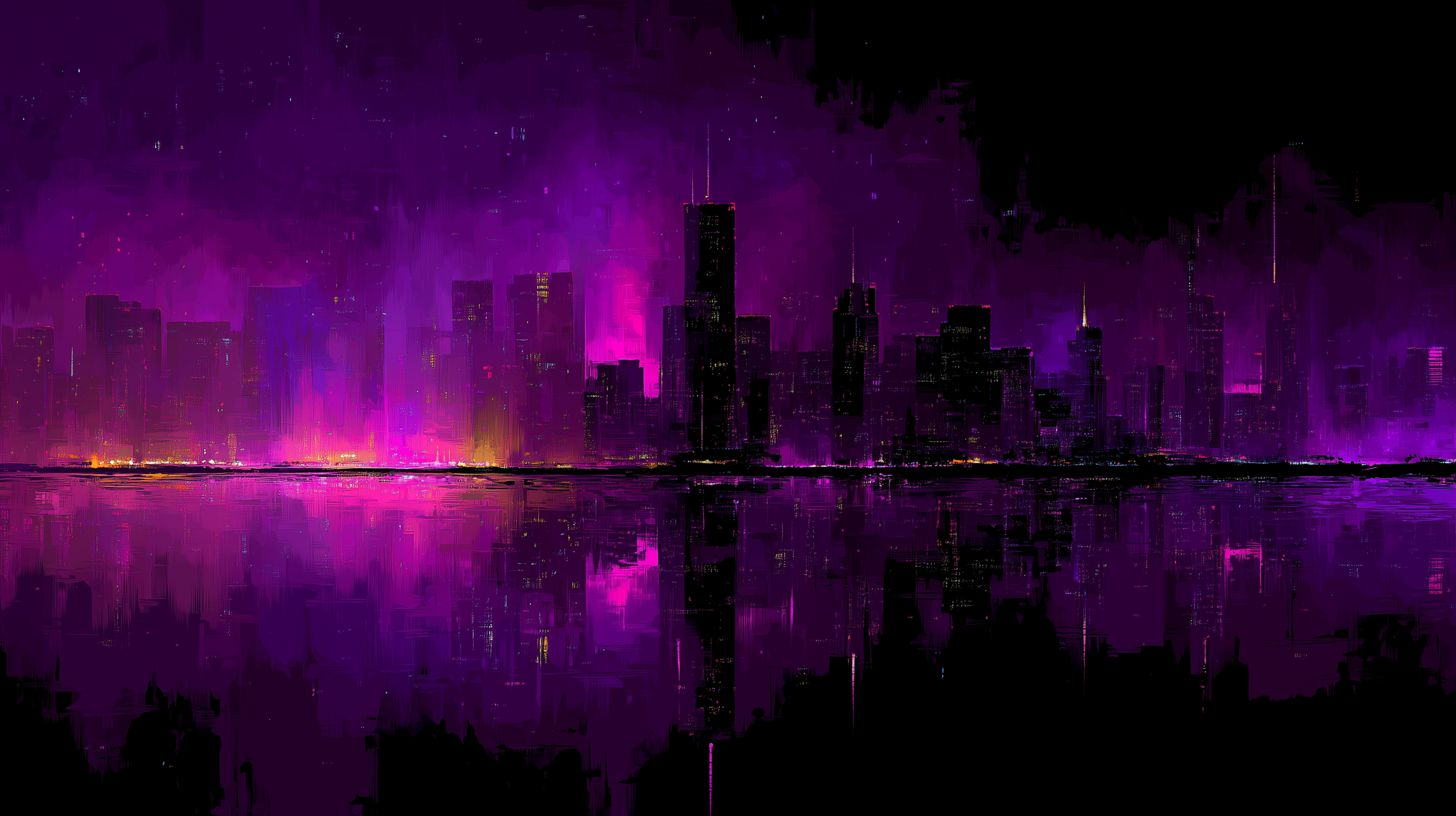 Prompt example: Digital art piece of an abstract city at night, deep purple skies, black silhouettes, neon reflections, vibrant and dramatic lighting, bold composition