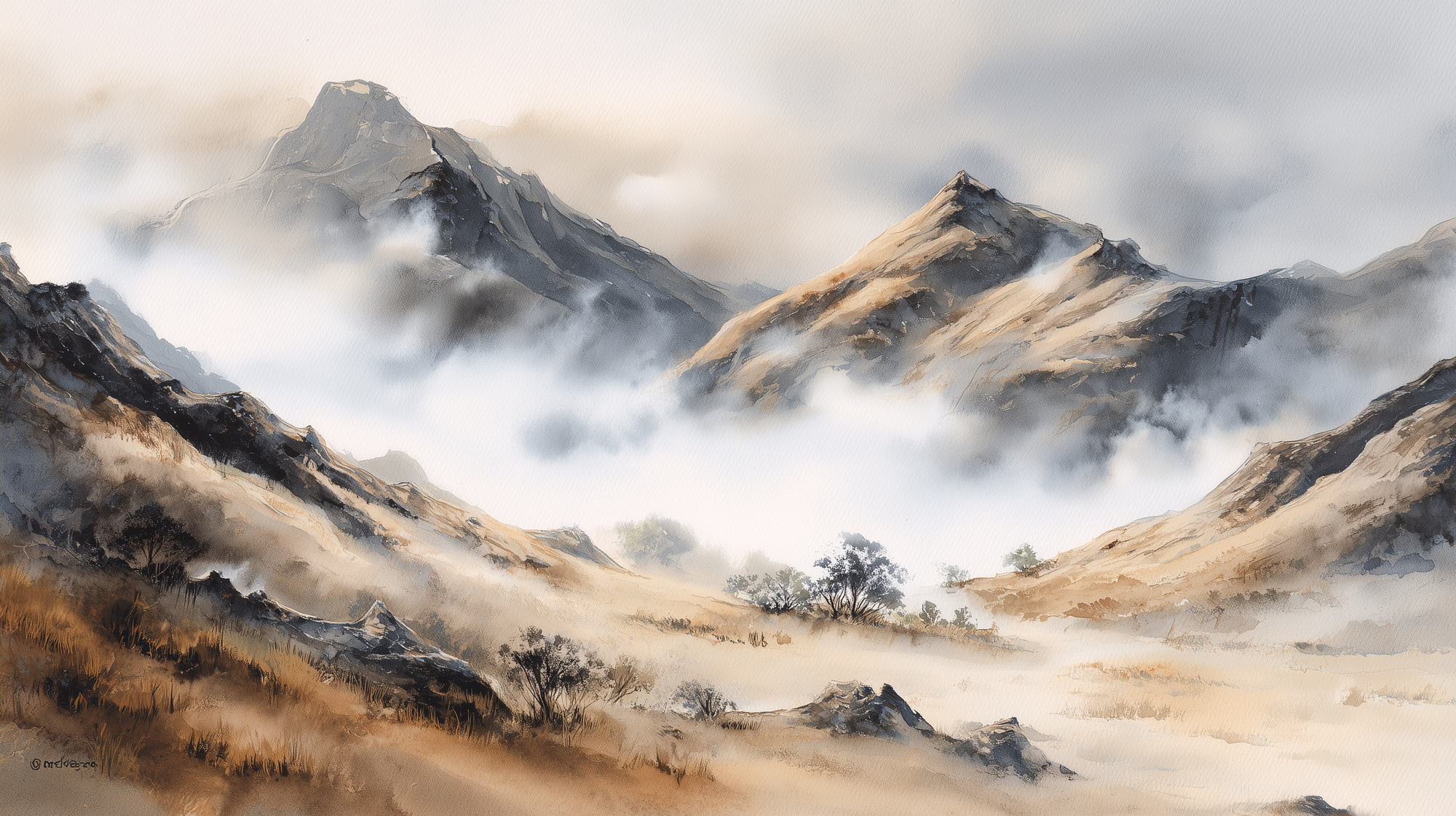 Prompt example: Watercolour painting of a quiet mountain landscape with soft mist, neutral tones, pastel greys and warm beige, calm and peaceful mood