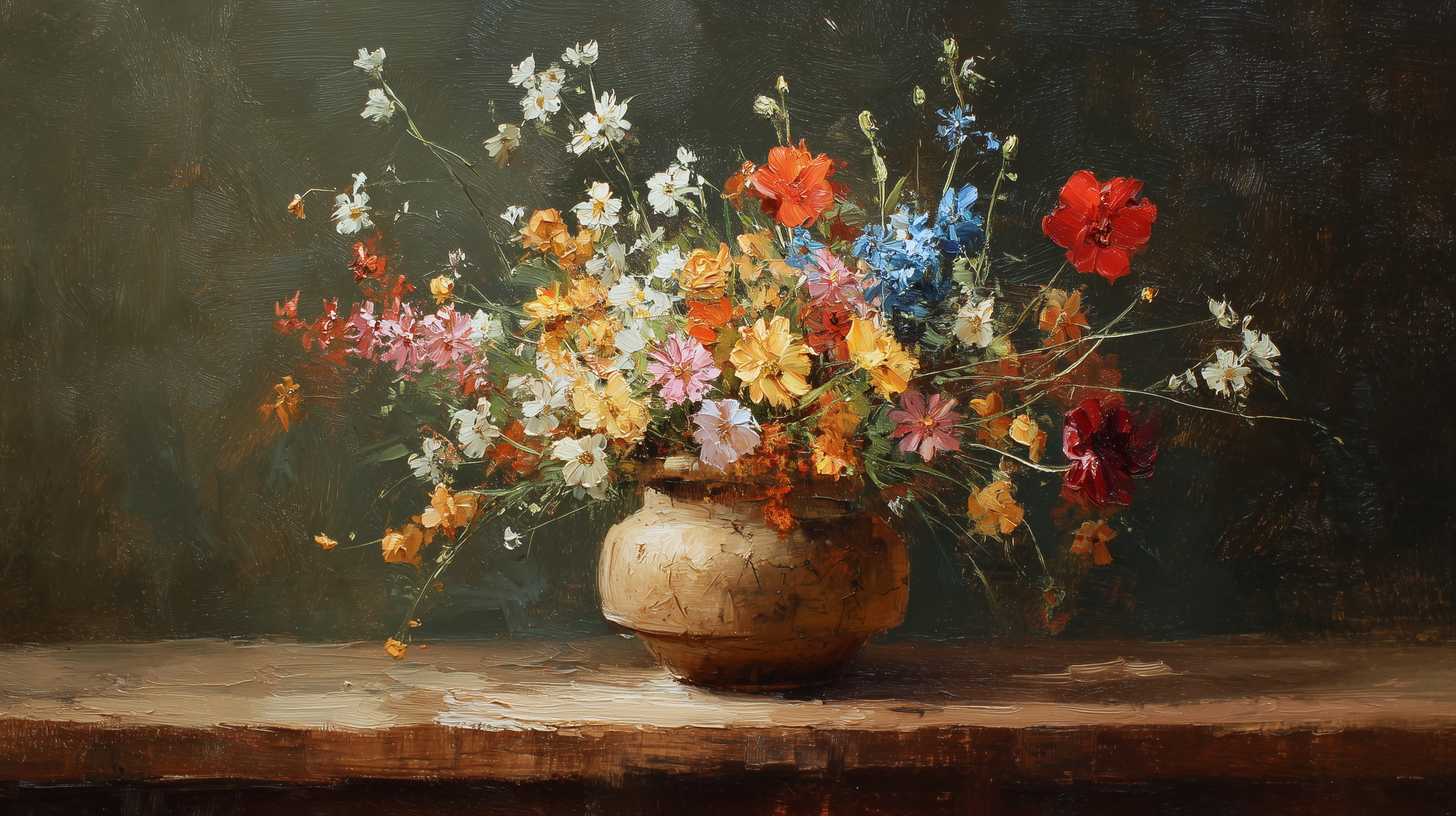 Prompt example: Oil painting of wildflowers in a rustic vase on a wooden table, warm ambient light, earthy orange and olive green tones, expressive brush strokes, nostalgic feeling